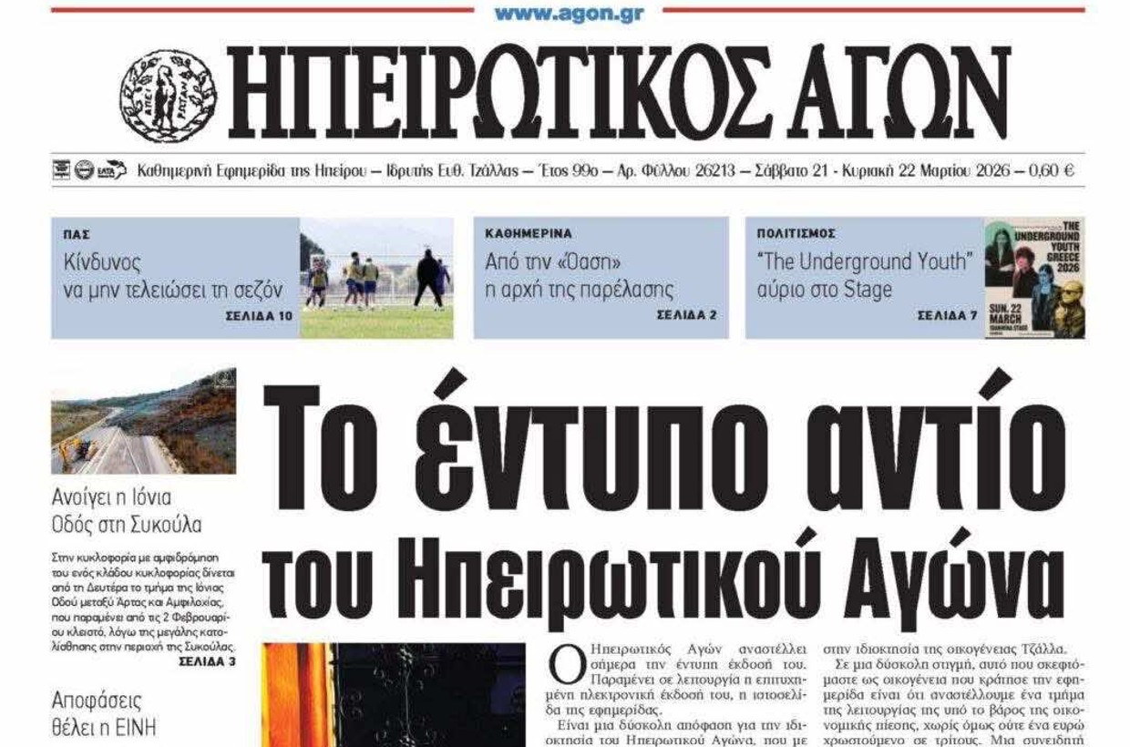 Ο Σύνδεσμος Ημερήσιων Περιφερειακών Εφημερίδων, εκφράζει τη βαθιά του θλίψη για την αναστολή της έντυπης έκδοσης της ιστορικής εφημερίδας των Ιωαννίνων «ΗΠΕΙΡΩΤΙΚΟΣ ΑΓΩΝ», ιδρυτικού μέλους του Συνδέσμου, η οποία κυκλοφόρησε για πρώτη φορά το 1924 και επί 100 και πλέον χρόνια αποτέλεσε σταθερό σημείο αναφοράς για την Ήπειρο και τον ελληνικό Τύπο!